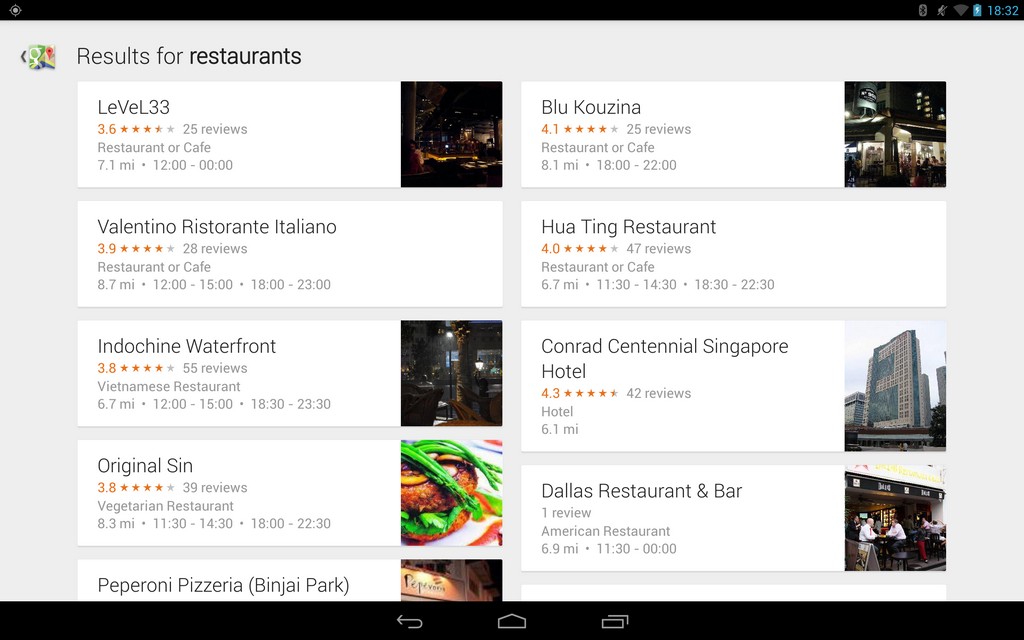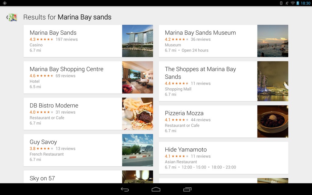 The smartphone version is a little different from the tablet version, when it comes to search. Large “cards” of, say, locations to eat and drink come up, unlike the smaller icons on the tablet, where Google seems more interested in packing more information onboard.
